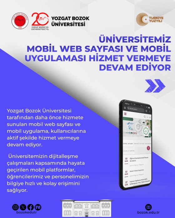 Üniversitemiz, dijital altyapısını güçlendirme hedefi doğrultusunda mobil platformlarını aktif şekilde kullanmayı sürdürüyor. Daha önce hizmete sunulan mobil web sayfası ve mobil uygulama, üniversitemizi “her an, her yerde” erişilebilir hale getirerek kurumsal iletişime önemli katkı sağlıyor.